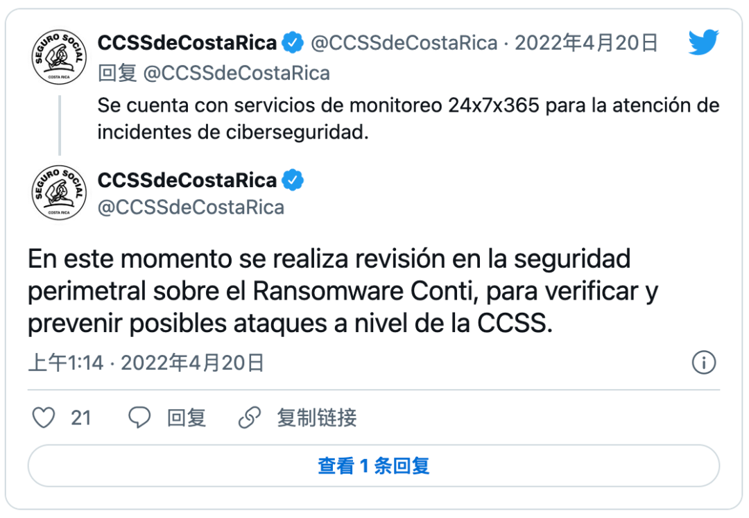 當(dāng)?shù)貢r間4月18日,哥斯達(dá)黎加財政部的網(wǎng)絡(luò)系統(tǒng)就遭到黑客攻擊,政府隨即采取預(yù)防性措施,關(guān)閉了部分系統(tǒng)。該國養(yǎng)老金、公共系統(tǒng)薪酬支付以及稅收、進出口系統(tǒng)均受到不同程度影響。