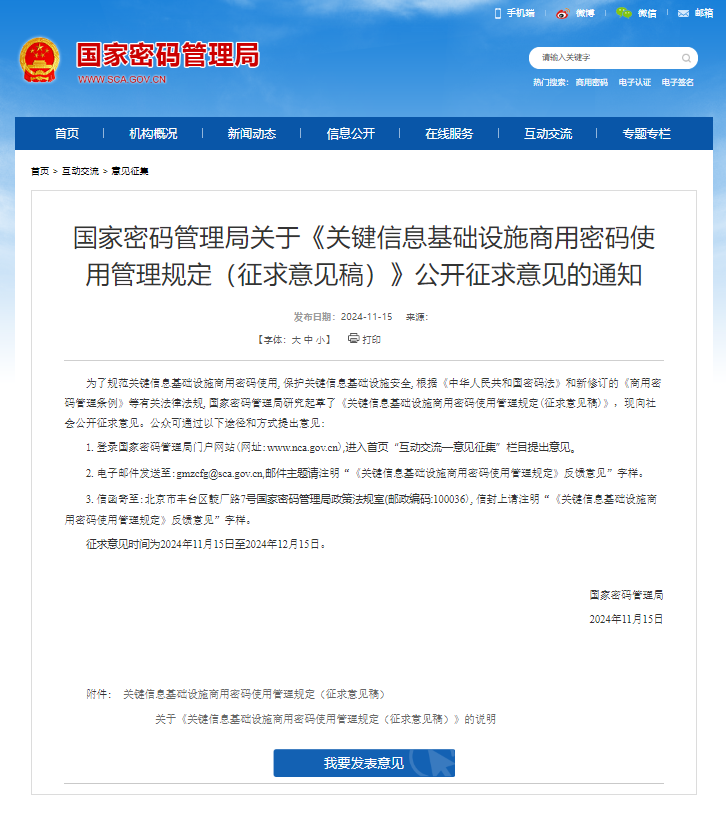 1.登錄國家密碼管理局門戶網(wǎng)站(網(wǎng)址:www.nca.gov.cn),進入首頁“互動交流—意見征集”欄目提出意見。