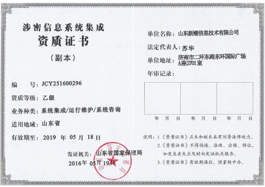 熱烈祝賀我公司獲得涉密信息系統(tǒng)集成資質(zhì)
