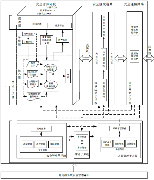 第三級(jí)系統(tǒng)安全保護(hù)環(huán)境設(shè)計(jì)示例:根據(jù)“一個(gè)中心”管理下的“三重保護(hù)”體系框架,構(gòu)建安全機(jī)制和策略,形成定級(jí)系統(tǒng)的安全保護(hù)環(huán)境。該環(huán)境分為如下四部分:安全計(jì)算環(huán)境、安全區(qū)域邊界、安全通信網(wǎng)絡(luò)和安全管理中心。每個(gè)部分由1個(gè)或若干個(gè)子系統(tǒng)(安全保護(hù)部件)組成,子系統(tǒng)具有安全保護(hù)功能獨(dú)立完整、調(diào)用接口簡(jiǎn)潔、與安全產(chǎn)品相對(duì)應(yīng)和易于管理等特征。安全計(jì)算環(huán)境可細(xì)分為節(jié)點(diǎn)子系統(tǒng)和典型應(yīng)用支撐子系統(tǒng);安全管理中心可細(xì)分為系統(tǒng)管理子系統(tǒng)、安全管理子系統(tǒng)和審計(jì)子系統(tǒng)。