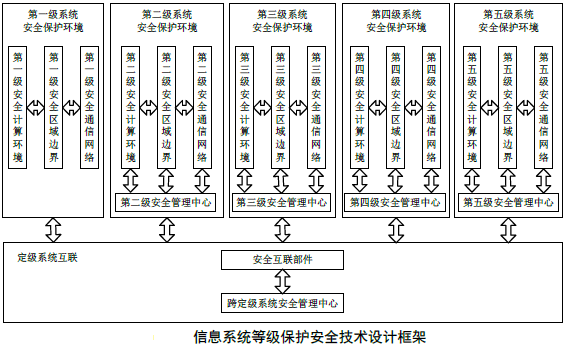 信息系統(tǒng)等級(jí)保護(hù)安全技術(shù)設(shè)計(jì)包括各級(jí)系統(tǒng)安全保護(hù)環(huán)境的設(shè)計(jì)及其安全互聯(lián)的設(shè)計(jì)。各級(jí)系統(tǒng)安全保護(hù)環(huán)境由相應(yīng)級(jí)別的安全計(jì)算環(huán)境、安全區(qū)域邊界、安全通信網(wǎng)絡(luò)和(或)安全管理中心組成。定級(jí)系統(tǒng)互聯(lián)由安全互聯(lián)部件和跨定級(jí)系統(tǒng)安全管理中心組成。